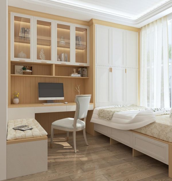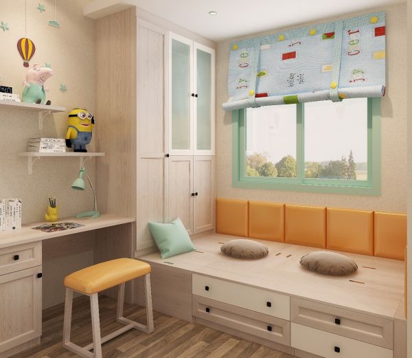 沿窗打造榻榻米,保证充足采光,日常居住更舒适。在榻榻米的床尾打造靠墙衣柜,根据衣服给衣柜内部合理划分区域,保持卧室整洁有序的同时,日常翻找也更加便捷!书桌紧靠衣柜,充分利用墙上空间做书柜,学习用品、书籍都能收纳其中。