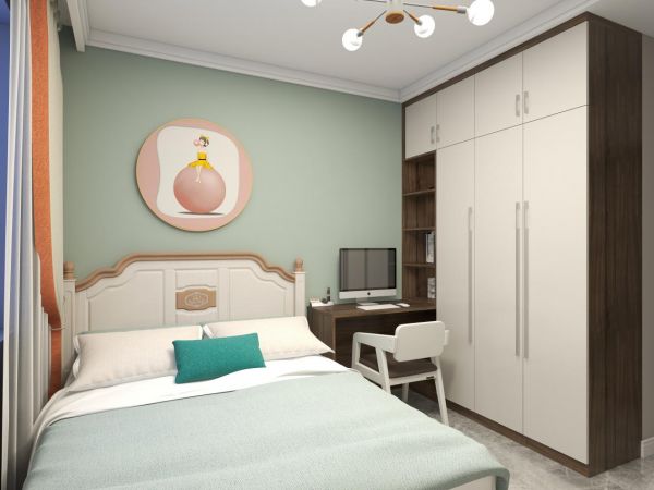 顶天立地式衣柜增大卧室储物空间,衣柜靠床头处延伸出书桌,右边做开放格储物作书柜,上层放不经常阅读的书籍、中部可以放需要日常翻阅的文件、下层则可以放些日常生活的杂物,合理规划,让卧室井然有序~