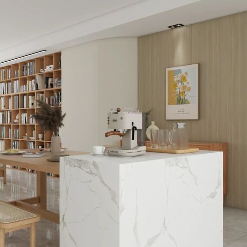 在阅读的时候,女作家喜欢喝茶和咖啡,所以在客餐厅特意搭建了岩板吧台,咖啡机、水壶、茶杯都可摆放,也更加方便。吧台旁是原木色餐桌+藤编椅,也让空间多了一份宁静,坐在这个地方吃饭也很治愈~
