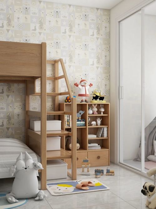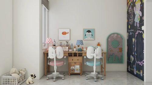 儿童房在客厅的斜对面,因为女主人有一个5岁的儿子和3岁的女儿,房间户型不够大,便安置了上下铺儿童床,这样既可以节省空间,孩子也互不干扰,床对面有两个学习桌,桌上摆放很多有趣的小摆件,她觉得这样能让孩子更有仪式感,也更喜欢这儿。为了孩子的坐姿端正,还特意买了可调节矫正靠背座椅。她常在这小小一方天地给孩子们讲故事,觉得无比幸福。