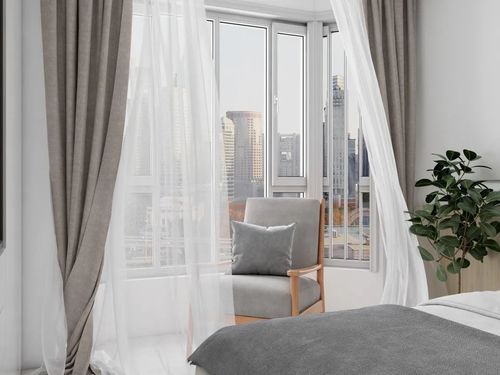 卧室的柜子有点意思,是镶嵌式的,看起来就像一面墙,电视也融入其中,躺在床上看电影,女作家说这是她夜晚放松的方式。阳台的窗帘选用素雅的色调,透过窗户,阳光洒进卧室,一股文艺气息扑鼻而来!