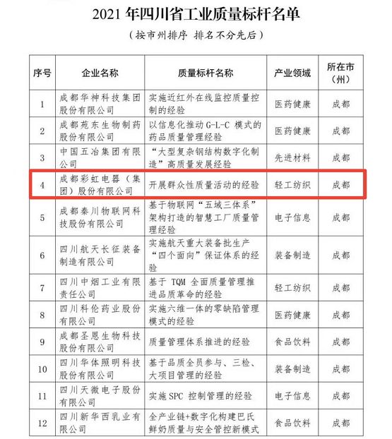 彩虹集团荣获“2021年四川省工业质量标杆”荣誉称号!