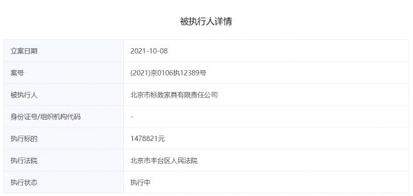 新浪家具频道讯 2021年10月8日,北京市标致家具有限责任公司(下称“标致家具”)被北京市丰台区人民法院列为“被执行人”,执行标的为1478821元,案号为(2021)京0106执12389号。