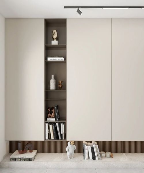 大面的落地窗,光线通透,客厅中间没什么遮挡。Jessica平时会在这里看杂志、招待好友。客厅的一整面墙,内为收纳空间,巧思的设计可以多出几平米的收纳空间,把服饰和包包都藏进去。外面是米白色柜门,能完美的隐藏在灰色的墙壁之中。