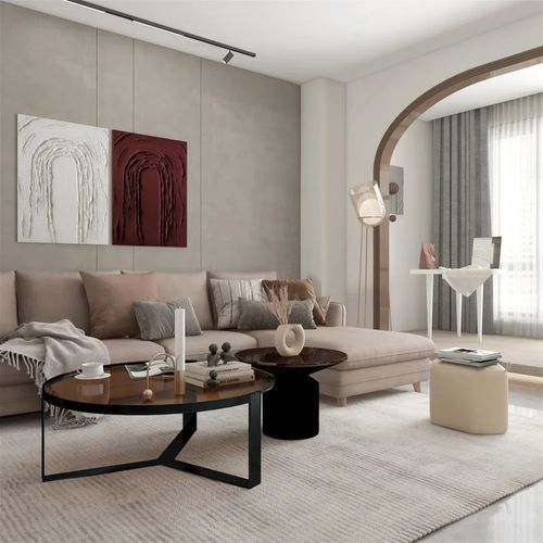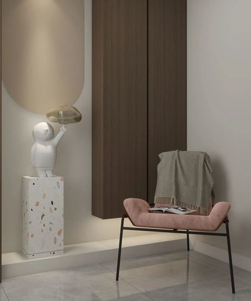 走进玄关,时尚感扑面而来,抽象童趣的雕塑艺术品,配合墙上的后现代几何人物画,仿佛走进了一个艺术展览馆,享受艺术的熏陶。靠墙的长方形组合柜,临时的物品放置再方便不过了,胡桃木色带来家的温馨感。