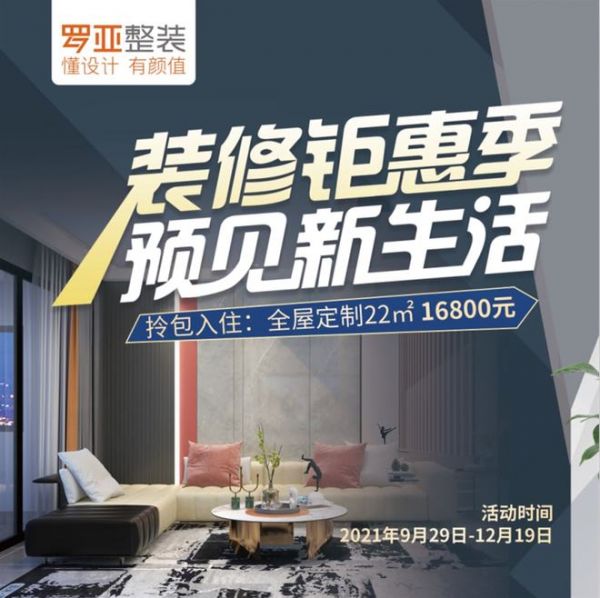 对于想“秋冬搞装修,新年住新房”的业主来说,四季度无疑是抢优惠、省大钱的好时机。为此,卡诺亚公司旗下的罗亚整装,在黄金装修季的9月29日-12月19日,实在实惠推出“装修钜惠季,预见新生活”全国普惠风暴活动,全屋定制仅需¥16800、拎包套餐只要¥31800、厨柜套餐¥4680、护墙板套餐¥4980、轻奢主义系列新品抢鲜价¥1199/㎡等,5个套餐任你选,软硬装一站购齐,心动之家,安心居家,轻松圆梦焕新家。
