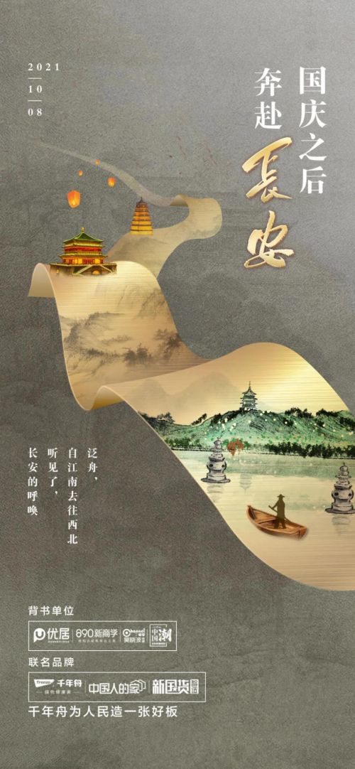 10月15日—17日,千年舟联合优居、890新商学丨吴晓波频道,人民日报文创“中国潮”等一众优秀品牌空降西安大唐不夜城,邀您做客「中国人的家」——“带国潮回家,向幸福出发”创意生活展,在繁华热闹、历史文化氛围浓厚的街区,我们将古都文化与新生活相融合,用趣味展览的形式全方位解读「中国人的家」。千年古都·百年好板,让我们一起穿越大唐,品鉴古今相融的“潮”文化!