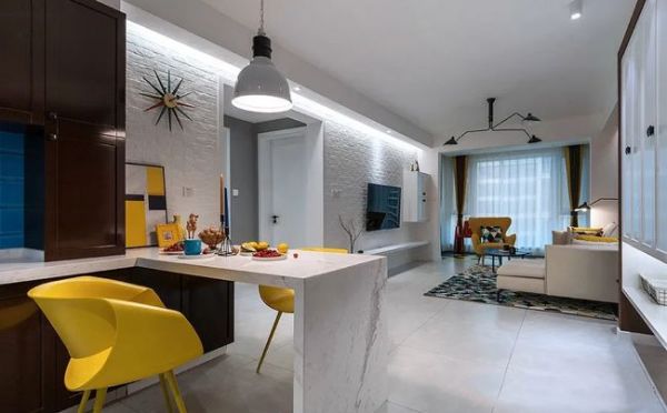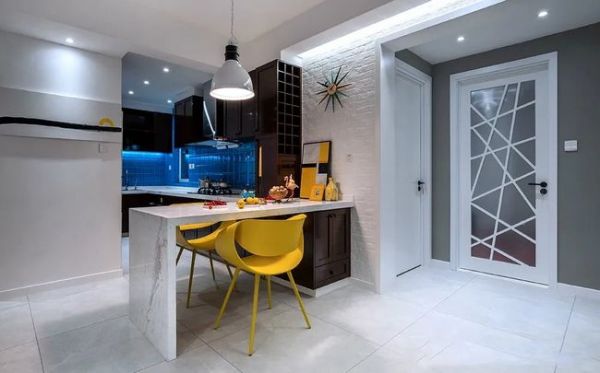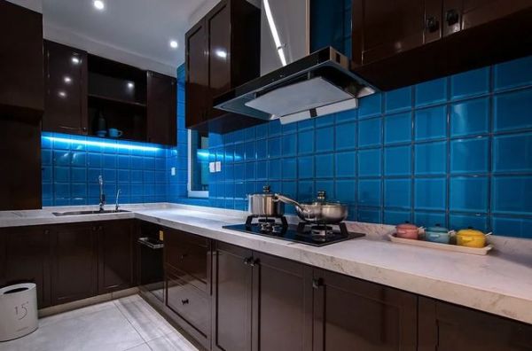 餐厅背后是一个开放式的厨房,厨房的设计装修就有很多人有不同的意见,亲戚们就说黑色的柜子不好看,而朋友却说这样的设计更有时尚感,大气舒适,特别是背景墙的设计,给人一种新鲜感。其实无论亲戚朋友怎么说,我对自己的新房装修设计都是非常满意的,是自己住的,肯定是自己喜欢的就好,你们说是吧?