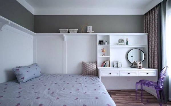 主卧室,采光非常好,定制的床,连接着梳妆台,而且在上方的空间做了一整层的收纳板,增大了室内的收纳。整个空间上的搭配让人很是舒适。
