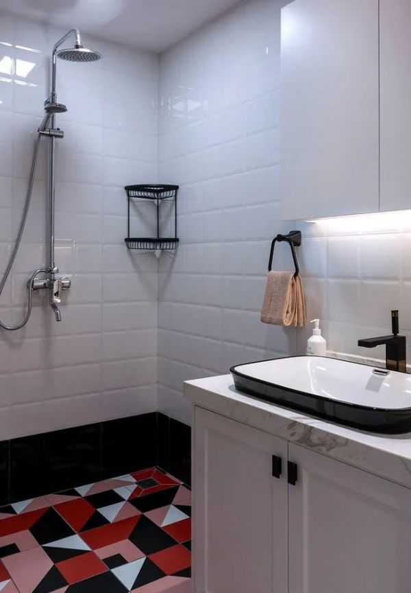 卫生间的空间足够大,就算没有做干湿分区也没有关系,地面的瓷砖设计色彩比较吸引人,不过地面没有做好防水条就不大好,毕竟水都到处流。