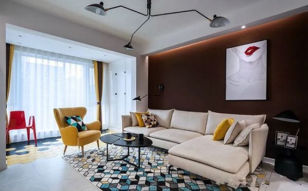 白色的皮质沙发和黄色的沙发椅搭配起来很好看,地面的白色瓷砖和阳台的色彩瓷砖做了严格的分割,功能区上的区分比较严格,但是这样搭配起来却非常的好看。