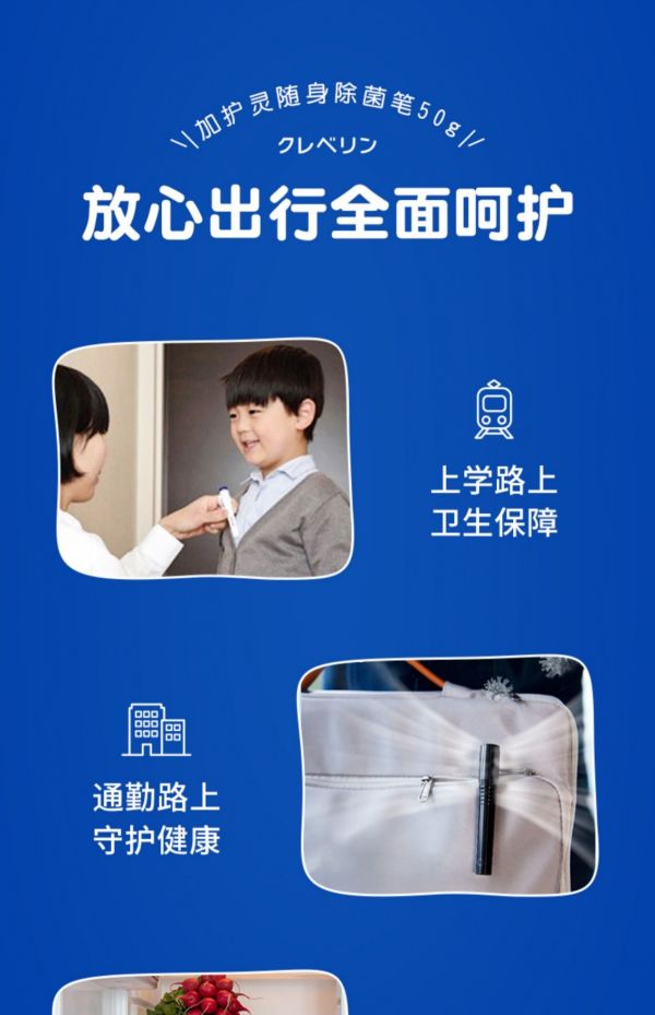 在国家“双减”政策的大背景下,越来越多的父母鼓励孩子走出家门,去到户外加强锻炼,增长见识,7天小长假正是陪孩子出行的好机会。小长假期间,各地人群大量聚集,带孩子出入这些人群密集场所,便会增加孩子感染细菌和病毒的潜在风险。出门佩戴加护灵除菌笔,便可以轻松帮助孩子远离细菌、病毒感染,为孩子增加一道健康防护。