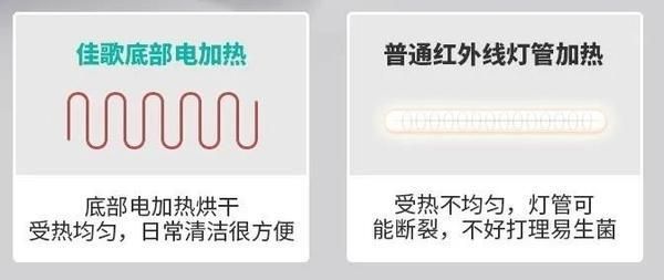 传统红外线灯管烘干范围受限,容易导致底部积水和碗盘受热不匀。佳歌集成灶将烘干技术改进,采用烤箱式底部加热。
