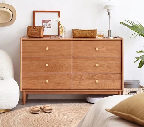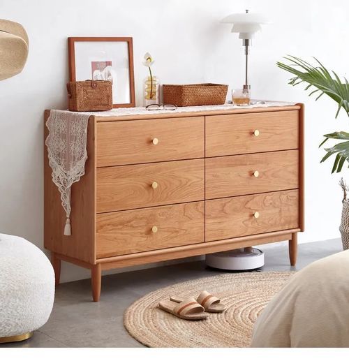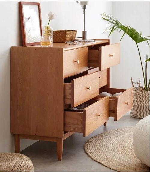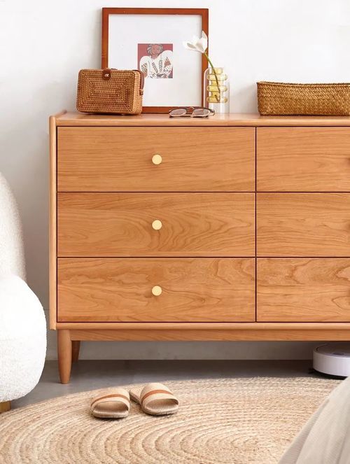 樱桃木因为有着细腻的木质,高雅的装饰效果,所以做出来的斗柜也比较简约百搭,无论是北欧的家还是日系的家,搭配上这样的斗柜也会觉得温馨治愈,樱桃木颜色随着时间还会慢慢变深,年代感满满。
