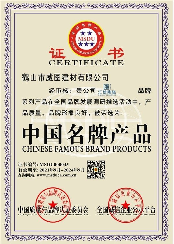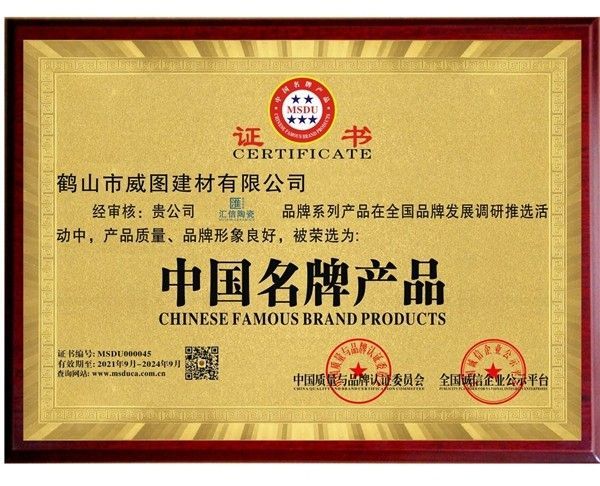 汇信陶瓷是佛山陶瓷的十大品牌之一,更是国内陶瓷的一线品牌,凭借过硬的企业资质,汇信陶瓷荣获zhong国驰名商标、广东省著名商标、环保陶瓷证书、中国国家强制性产品认证证书、广东省采用国际标准产品认可等多项国家认证。多次荣登央视频道。