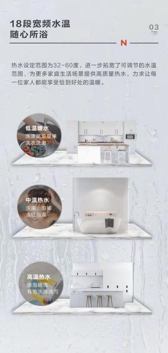 能率E5更有18段宽频水温范围,热水设定范围在32-60度,进一步拓宽了可调节的水温范围,为更多家庭生活场景提供高质量的热水,让每一位家人都能享受恰到好处的温暖。无论是低温暖水,洗涤蔬菜瓜果、洗衣洗漱,还是中温热水,洗澡、泡脚、浴缸泡澡,高温热水,浸泡碗筷、洗涤油污都是恰到好处。想做什么都是随心所浴。