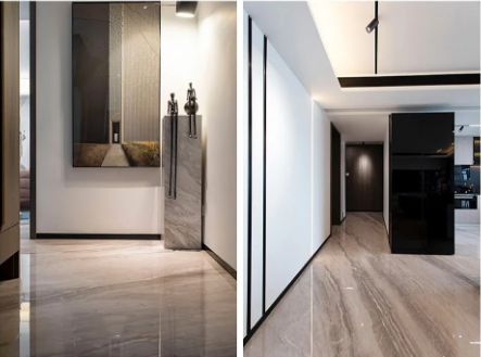 玄关处以灰白色作为主色调,给人一种干净简洁的感觉;地面沿用简一希腊灰大理石瓷砖进行密缝铺贴,以浅灰色为底色,砖面上分布着一些深浅不一的灰色纹理,自然细腻,高度还原了天然大理石的色泽和质感。一走入玄关处,密缝铺贴的效果就让人眼前一亮,同时也奠定了整屋时尚大气的基调。