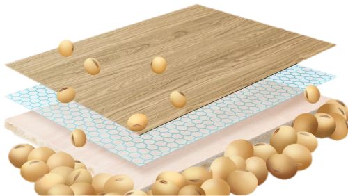 天然豆香板采用大豆蛋白胶代替普通人造板中使用的脲醛树脂胶,游离甲醛释放量不超过0.007mg/m³,从产品源头做到“无醛添加”,实现健康绿色环保。物理性能上,天然豆香板板芯结构更紧密,握钉力更强,抗折抗压强度更高,板材含水率稳定,温水浸泡72小时不开胶。