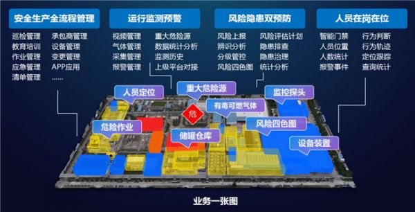 通过生产过程危险和有害因素的辨识,运用统计分析方法确定其风险程度,分为重大风险、较大风险、一般风险、低风险。安全风险分区管理即是在风险辨识的基础上,通过用红、橙、黄、蓝“四色图”对风险区域进行标示,并结合“两单三卡(安全风险分级管控清单、危害因素排查辨识清单、承诺卡、应急卡、应知卡)”实现对工厂安全风险的可视化管理。企业参照《危险化学品企业安全风险隐患排查治理导则》,实施隐患排查治理。根据企业隐患标准管理的不同,制定隐患排查标准数据库,主要包括隐患排查的计划排查、登记、整改、验收、核销等全过程闭环管理,和定期或实时报送隐患排查治理情况功能。