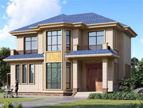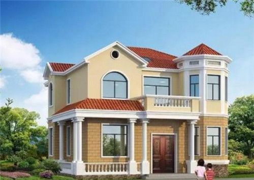 上图是一套欧式风格的双层别墅,整体颜色以黄色为主,给人一种时尚、温暖的气息,再配上白色的柱子和红色的琉璃瓦进行点缀,让建筑的色彩更加饱满,不会太单调。而中间入户门的设计,既有划分空间的效果,又方便业主出行。
