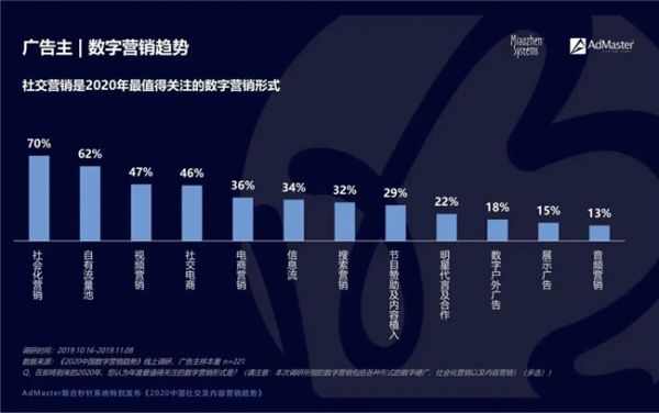 上述变化,从《2020中国社交及内容营销趋势》中的数据可见一斑 —— 社会化营销、自有流量池、视频营销、电商营销、信息流与搜索营销占有巨大的比例。对于新品牌(或小品牌)来说,这些数据是压力,也是机会。