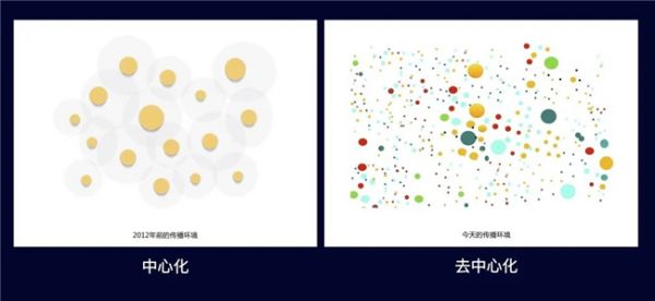 事实上,媒体产业总是在影响着企业传播的方式。上一个10年是营销场景发生剧变的一个年代,信息网络技术深刻地改变着营销的面貌。这是我2016年画的一张图,2012年前,企业的传播生态是中心化的,而之后,是去中心化的星河状。