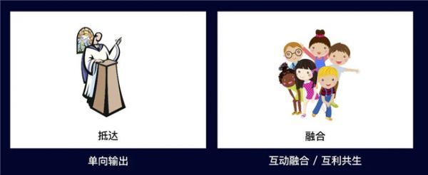 这幅图说明了营销环境的变化带来了企业品牌建设目标从“抵达”到“融合”到“购买”的改变,传播方式从“单向输出”到“互动融合/互利共生 ”。