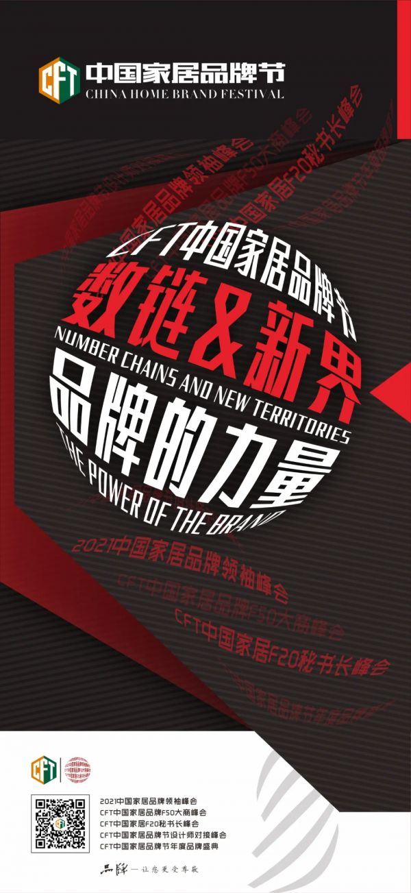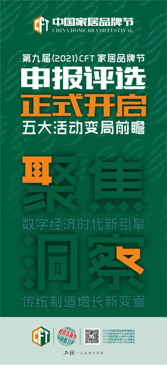 新格局新界线,探寻中国家居增长新曲线,2021 年 12 月17- 19 日,第九届(2021) CFT 家居品牌节暨中国家居品牌领袖峰会金匠奖焕新启程,近万家企业同台竞技,上千人与会报名,重磅大咖权威发声,中国家居品牌领袖峰会、F20秘书长峰会、F50大商峰会、F100设计师峰会、年度品牌盛典等活动重磅落地,两百多家媒体同步曝光,中国家居品牌的年度盛宴,中国家居品牌之路的全新起点。更多精彩即将呈现,品牌——让您更受尊敬!