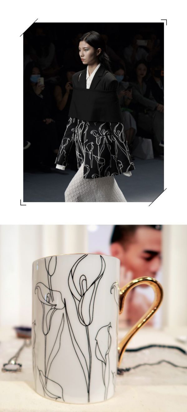 HAI STUDIO以充满概念前瞻性的时尚艺术形式活跃于时尚界,强调风格与材质的搭配,碰撞,与俄皇LOMONOSOV致力于创新突破的品牌调性不谋而合,此次联名带来了更多前卫性和都市优雅性。联名骨瓷马克杯中融入更多独特巧思,以马蹄莲作为设计灵感,用延伸状的线条花式与极简的色彩质感进行组合搭配,与秀场上“Wild Flowers”设计交相呼应,花朵柔美轻盈、黑白展现亦柔亦刚,轻松赋予更多生活的趣致体验,完美适应多种场景搭配。