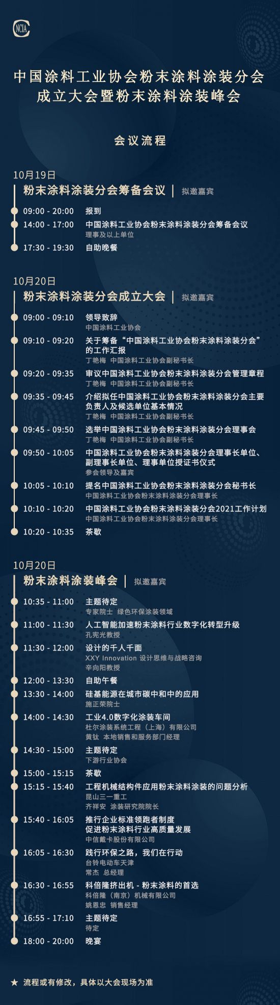 继2021年6月21日中国涂料工业协会粉末涂料涂装分会(筹)座谈会在江苏苏州太仓市宝龙喜来登酒店成功举办后,中国涂料工业协会粉末涂料涂装分会成立大会暨粉末涂料涂装峰会将于2021年10月19日至20日在上海召开。