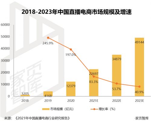 到2020年,根据艾瑞咨询《2021年中国直播电商行业报告》显示,中国直播电商市场规模达到1.2万亿,年增长197%,预计未来三年年均复合增速为58.3%,2023年直播电商规模将超过4.9万亿元。