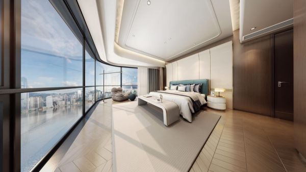 为了打造270°的景观视野,『天启』组团在规划布局上经过精心考量,沿江倾斜15-30°波浪形排开,让江景更有延伸感。并大面积采用简约大气的落地玻璃幕墙,配以阔景阳台,将一线珠江江景、日月星辰通通收藏进生活。在“好宅”里的每一刻,都在与自然之间进行着亲密的对话。