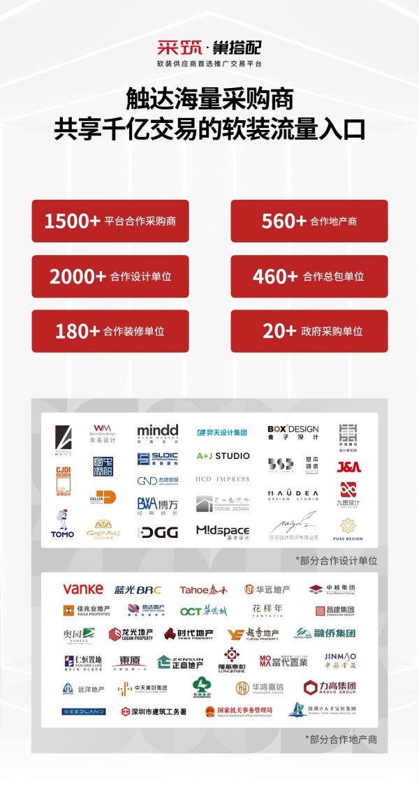 这次,巢搭配携手采筑打造“软装B2B供应链服务平台”,依托万科的资源优势,融合地产商、设计单位、供应商等多方资源,以“全流程专业设计服务”作为护城河,多业态、多场景创造海量软装商机。