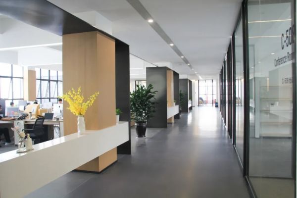 进入园区的办公区,可以看到整个办公区整洁开阔,办公、会客、休憩三大功能区用玻璃隔断,打造开放、有序、高效的办公体验。