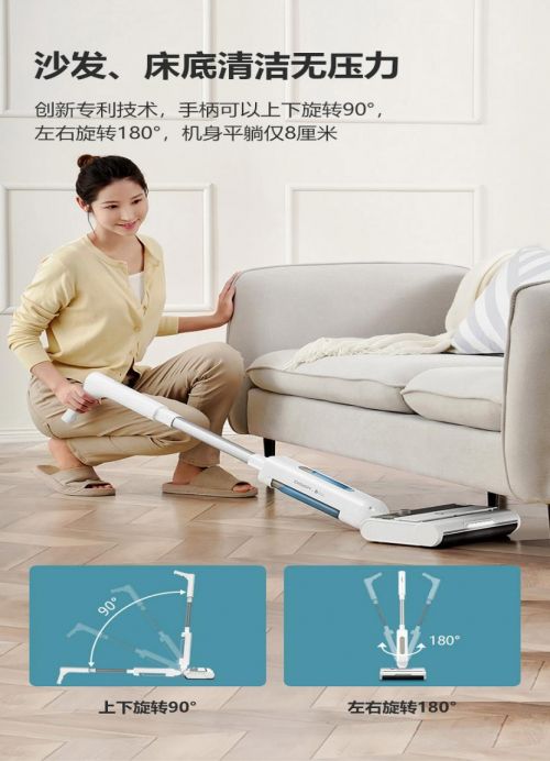 首先在使用的时候,滴水洗地机仅重3.55kg,而且还自带牵引力,父母仅需控制方向即可,而且床底下、沙发下等低矮场景,一般的洗地机和吸尘器由于技术和体积限制做不到平躺清理,但是滴水洗地机最大程度可以上下90°、左右180°旋转。