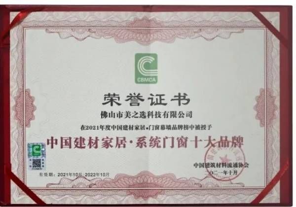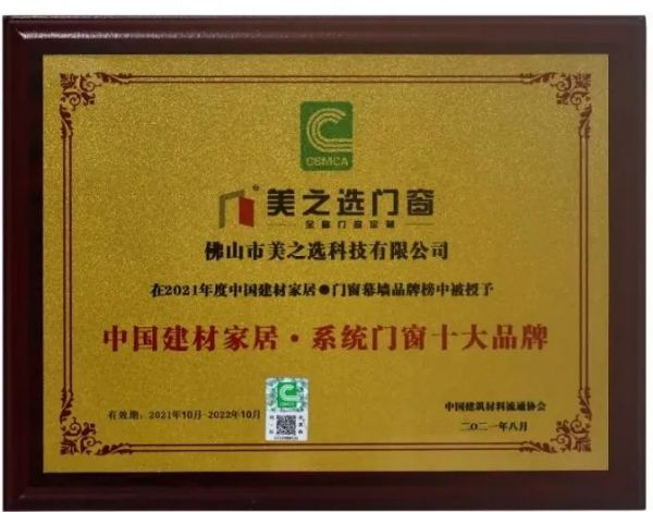 美之选门窗作为铝合金门窗行业知名品牌,以24年的行业沉淀、出众的品牌口碑,在众多知名企业中脱颖而出,荣获“中国建材家居·系统门窗十大品牌”。