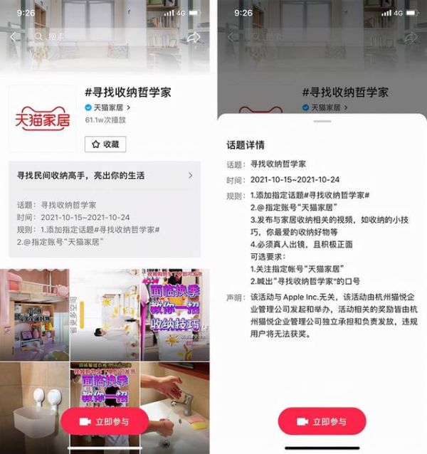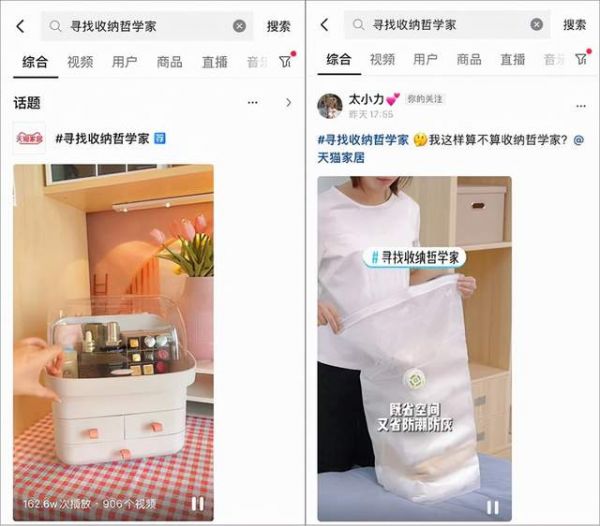 活动期间,用户发布与家居收纳相关的视频,如收纳小技巧,最喜爱的收纳好物等,并添加置顶话题 #寻找收纳哲学家#,@指定账号“天猫家居”,即有机会获得现金奖励和平台流量扶持。