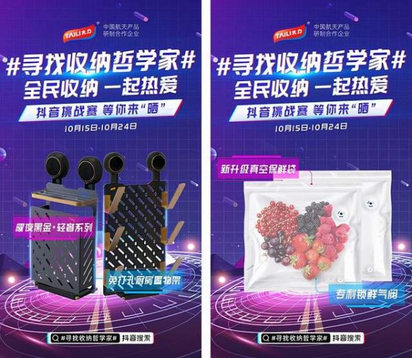 凭借敏锐的市场洞察力,太力品牌紧追营销新动向,结合“收纳”的概念内核,2021年10月15日-10月24日,携手众多家居收纳品牌参与天猫家居全民收纳活动,顺势在抖音平台发起 #寻找收纳哲学家# 挑战赛活动,寻找民间收纳高手,亮出你的生活!