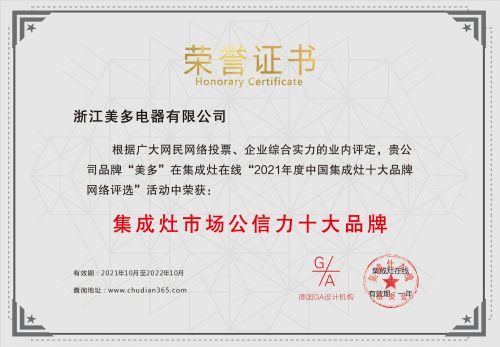 2021欣潮暨欣邦科技第16届建材家居颁奖盛典线上正式启幕,“2021年度中国集成灶十大品牌网络评选”结果重磅出炉,根据广大网民网络投票、企业综合实力的业内评定,美多集成灶在此次评选中荣获“集成灶市场公信力十大品牌”奖项,以过硬的企业实力和品牌影响力获得市场的认可!