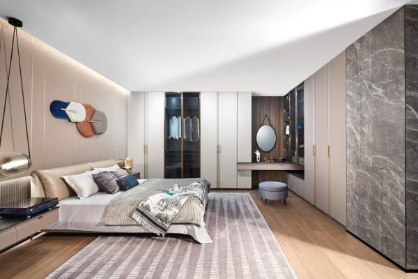 欧派全屋定制在家居空间配色上采用黄金配色比例,即依照卧室的主要布局色彩附着点进行分配,分别在位于主背景(墙面、顶面、地面)、家具以及软装饰品三部分之中以6:3:1的配色比例搭配,主背景色彩占比60%、家具色彩占比30%、软装饰品10%,让整体视觉更加协调舒适。