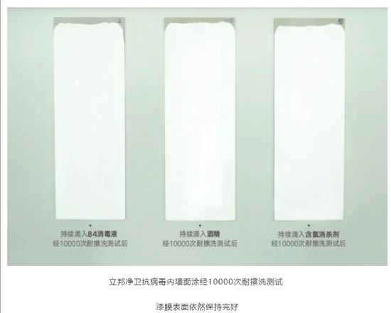 经测试,立邦净卫抗病毒内墙涂料的抗病毒性能符合T/CNCIA 01014-2020《抗菌及抗病毒涂料》标准中I级要求,经84消毒液、酒精和二氯异氰消毒片等三种消杀剂持续滴注与10000次耐擦洗后漆膜表面依然保持完好,为空间环境和物体表面提供持续的健康防护。