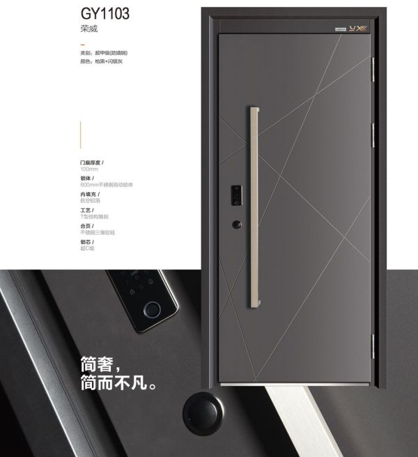 除了门体本身具备强劲的实力内涵,御翔安全门在颜值上也颇为用心。以御翔GY1103荣威超甲级钢甲门为例,它使用枪黑和闪银灰的配色,以T型结构雕刻,门面线条鲜明流畅而不死板,表现动静结合之美,在清晰的门框轮廓中透露出简而不凡的简奢气质。另一款GX1201荣辉防御门则使用宝马灰和银灰的高级配色,从颜色深浅明暗对比中突出卓尔不凡,曲线的弧度恰到好处优美生动,在光与影的应用之中,凝聚属于御翔安全门的不凡美学。御翔安全门其余福海、福喜、荣进等系列门产品亦具有各自独特的设计风格,系列名称吉祥讨喜,每一款都拥有“过人颜值”,做到颜值实力“两手硬”。