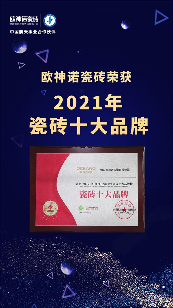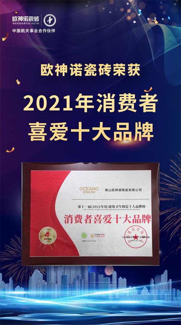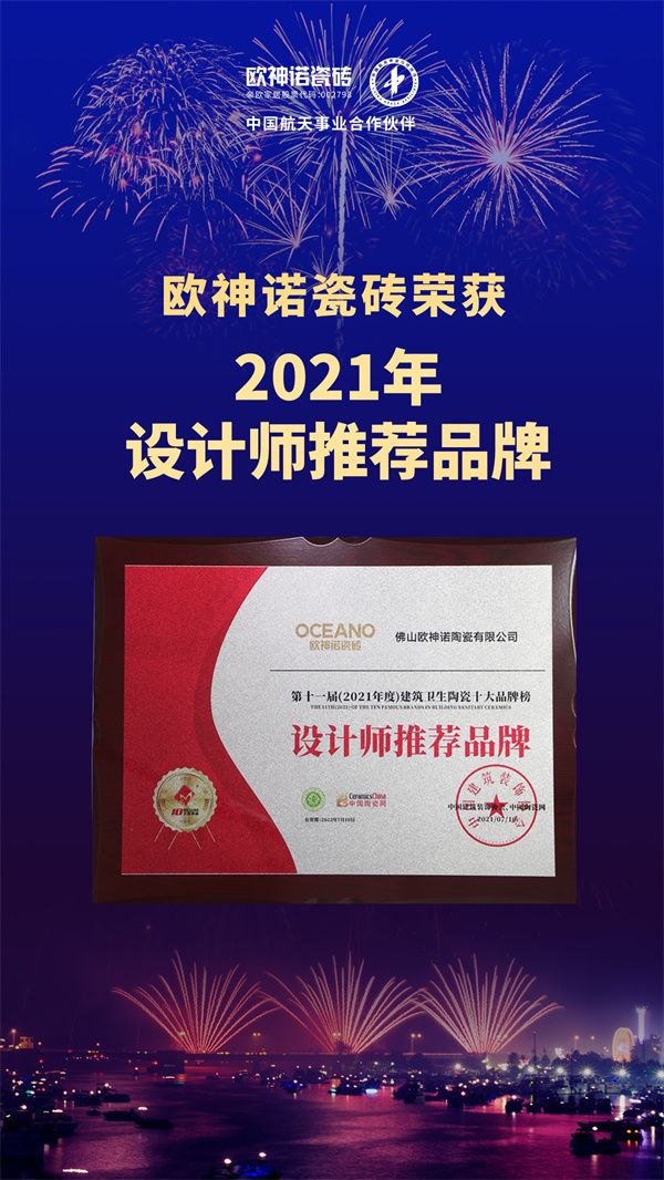 锐意创新,载誉前行。荣膺2021“瓷砖十大品牌” ”消费者喜爱十大品牌“”设计师推荐品牌“三大殊荣,是对欧神诺品牌综合实力的肯定,也是对欧神诺的赞誉。未来欧神诺将以“雅奢生活家”品牌新定位为内核聚焦用户体验,坚持技术创新和设计创意,为助力中国瓷砖打造具有世界竞争力的具有代表性的民族瓷砖品牌提供持续的创新价值。