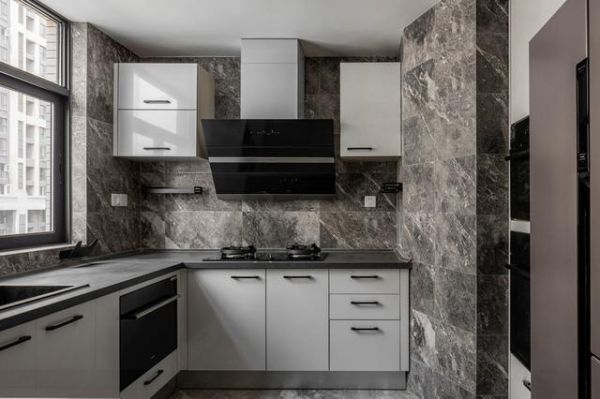 厨房中线条简洁流畅,深灰色大理石纹路极强的自然感,白色光面饰板让整个空间更具通透感。