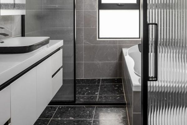 卫生间选择的玻璃门游走在透和隐之间,空间的层次也延伸开来,黑白灰的搭配也营造出静谧雅致的氛围。