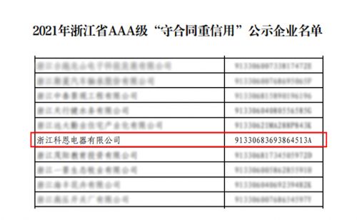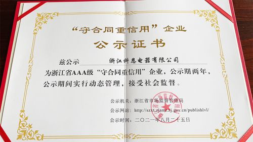 根据《浙江省“守合同重信用”企业公示办法》规定,由企业自愿申报、系统自动测评、各地核实推荐、大数据比对和双随机实地核查,2021年浙江省AAA级“守合同重信用”企业公示名单出炉,凭借着诚信守法的“契约”精神,严谨规范的合同管理体系以及良好的经营效益,进一步强化“守法”意识的浙江科恩电器有限公司荣获浙江省AAA级“守合同重信用”荣誉。