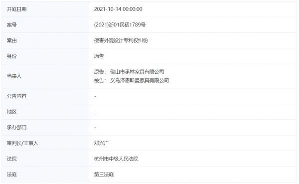 新浪家具频道讯 2021年10月14日,林氏木业(佛山市承林家具有限公司)控告义乌泽恩斯曼家具有限公司“侵害外观设计专利权纠纷”一案在杭州市中级人民法院开庭。