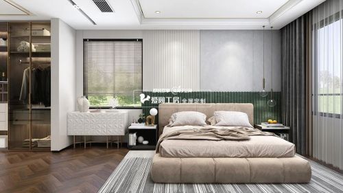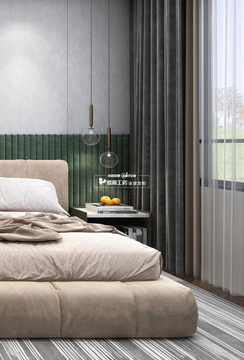 主卧的设计更加偏向于柔和之感。低饱和色彩与温柔质感给予的慰帖,是与梦对话的最佳语言。一个高质量的睡眠是每个人整日动力的源泉。采用了更加简洁的线条和清爽的构思,引导人们卸下对外界的防备与疲惫,在舒适中进入梦境。