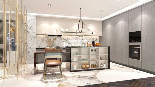 厨房开放式设计打开西式厨房生活,合聚之间架起家庭交流桥梁。人间的鲜活烟火气,空间的层次条理感,不同材质的碰撞与糅合,在这里得到平衡。搭配错落构成形式满足不同收纳,更贴近当代人对生活理念的需求。