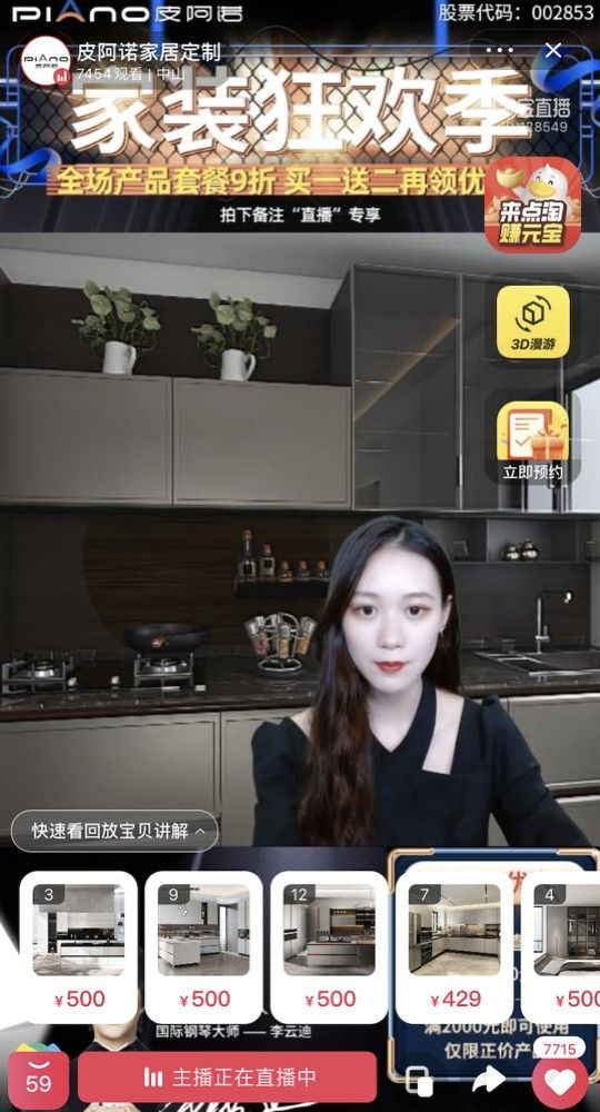 除此之外,皮阿诺还带着消费者玩起了“云逛街”,利用3D建模技术搭建沉浸式全屋定制3D样板间,结合直播新模式,提供漫游式购物体验,实现精准推荐和智能导购,为消费者提供省时、省钱、省心的全屋解决方案。